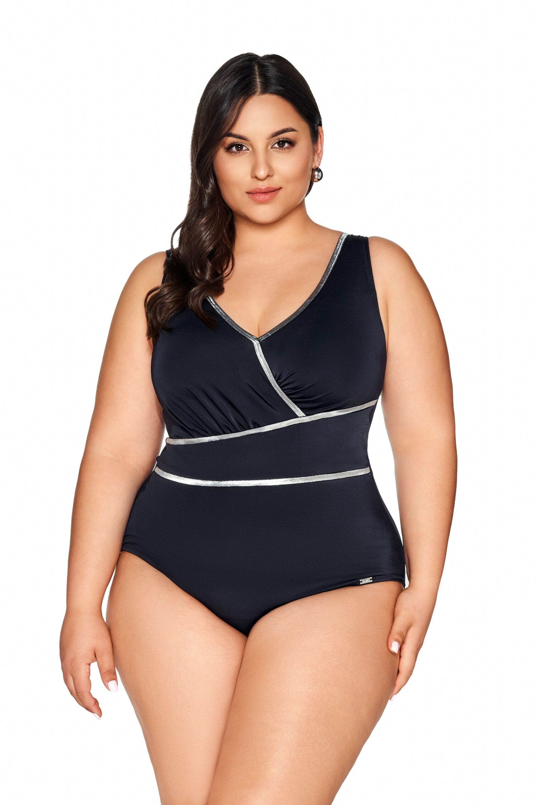 Купальник совместный арт. 62 выполнен с мягким лифом, на запах, с внутренней стороны спереди купальник продублирован сеткой, к лифу пришиты поролоновые вкладыши, под грудью корректирующая резинка, широкие бретели разгружают позвоночник, а блестки в виде блестящих лент добавили костюму легкости и элегантности.