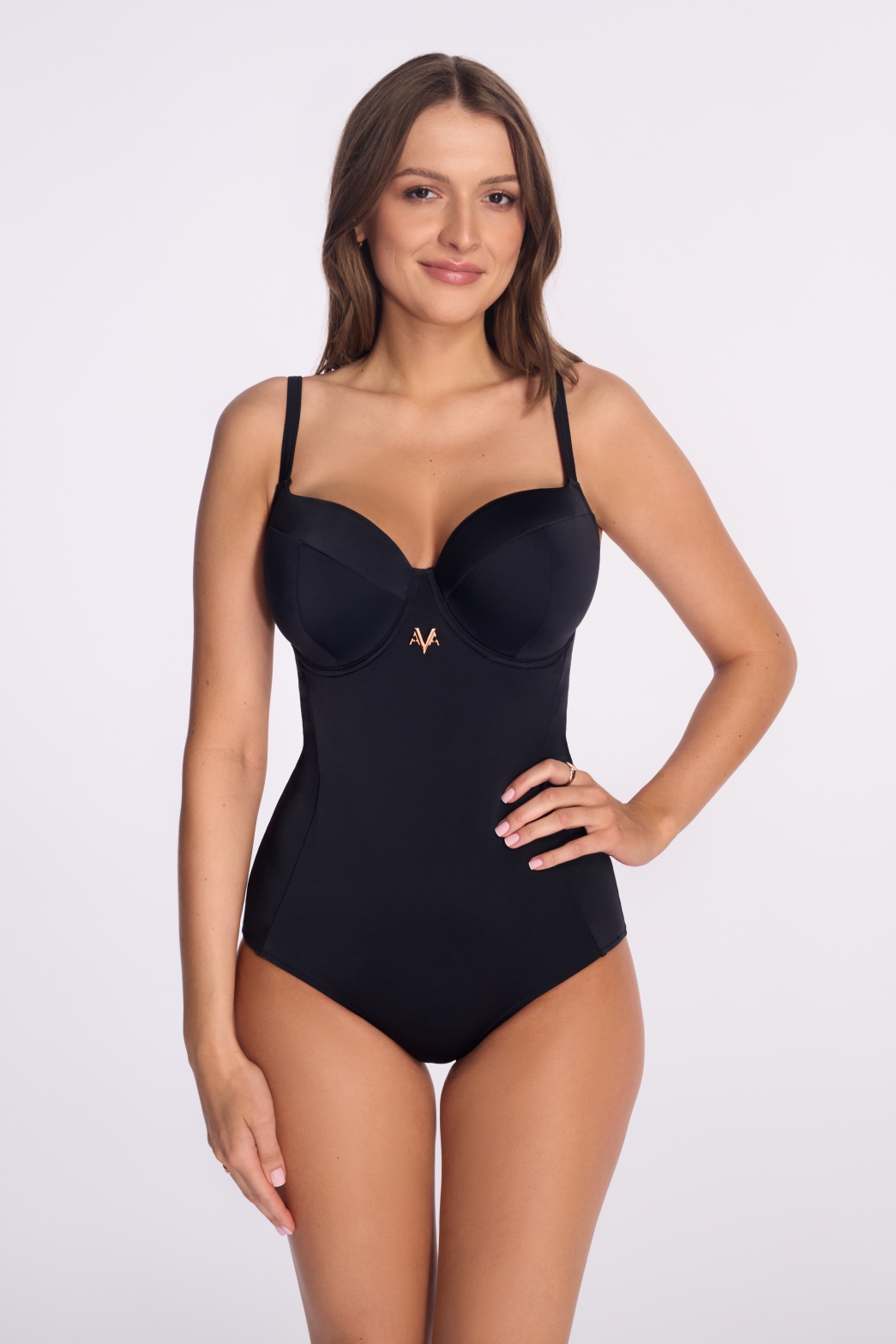 Совместный купальник 70 для пляжного отдыха. Лиф купальника на косточках, на тонком поролоне, с внутренней стороны спереди купальник продублирован сеткой, под грудью пришита широкая резинка, на спине металлическая застжка. Тонкие бретели регулируются по длине. Купальник отлично подойдет для пляжного отдыха и для похода в бассейн. Встроенная в костюм надежная конструкция бюстгальтера с полной чашкой удобно стабилизирует бюст, аппетитно подчеркивая его в области декольте, глубокий вырез на спинке купальника подчркивает чувственность и современный стиль. Золотой логотип по центру между чашечками добавляет элегантности и изысканности.SKJ70 U купальник совместный