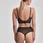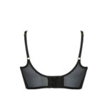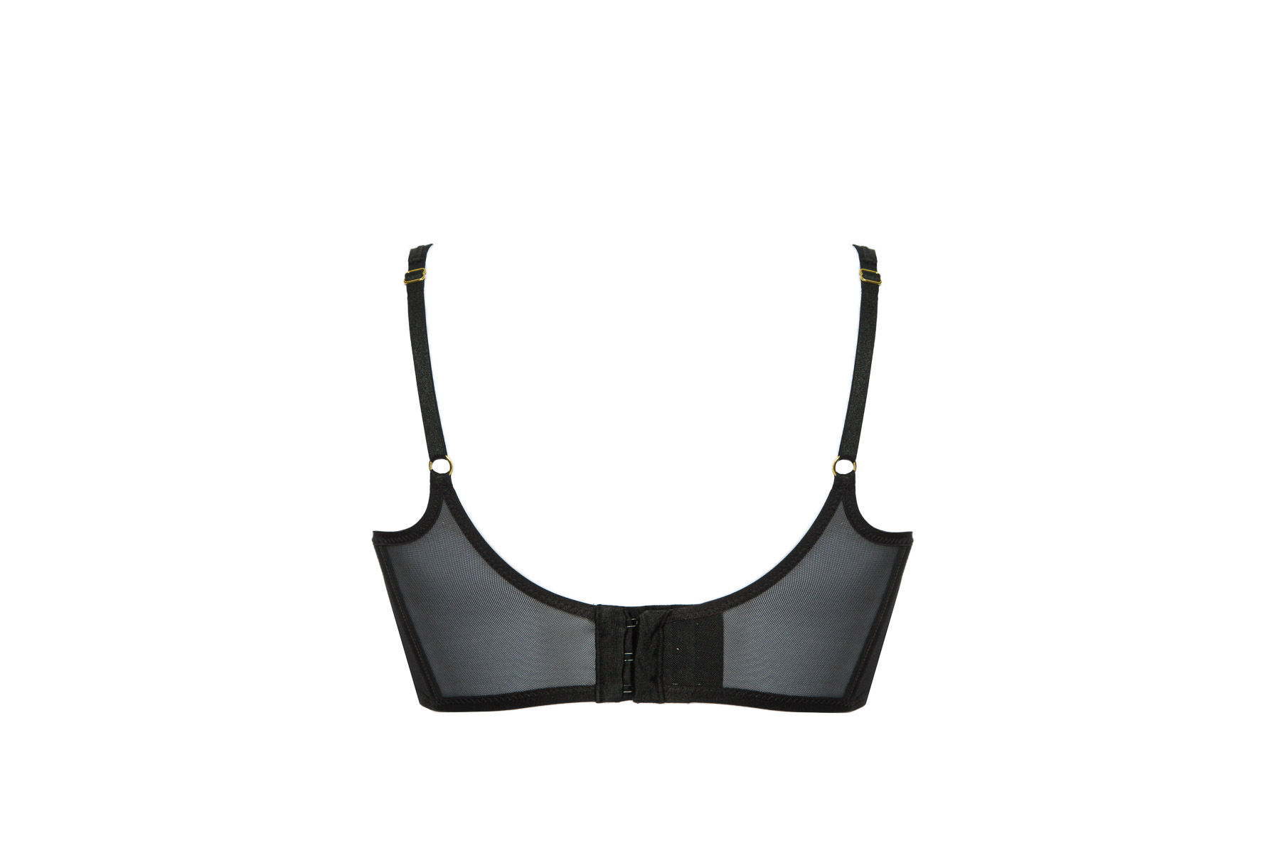 Бюстгальтер выполнен из сетки, с мягкими бесшовными чашками на косточках, с двумя дополнительными боковыми поддержками. Окантовка косточек на чашках и вертикальные швы декорированы атласными лентами. Бретельки регулируются по длине, не отстгиваются. На спине застжка на удлинитель, количество крючков в ряду застжки увеличивается пропорционально размеру бюстгальтера. Фурнитура металлическая цвета золота. Бюстгальтер идеально сочетается с трусиками из коллекции .Sono M бюст