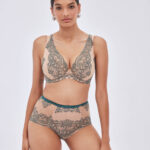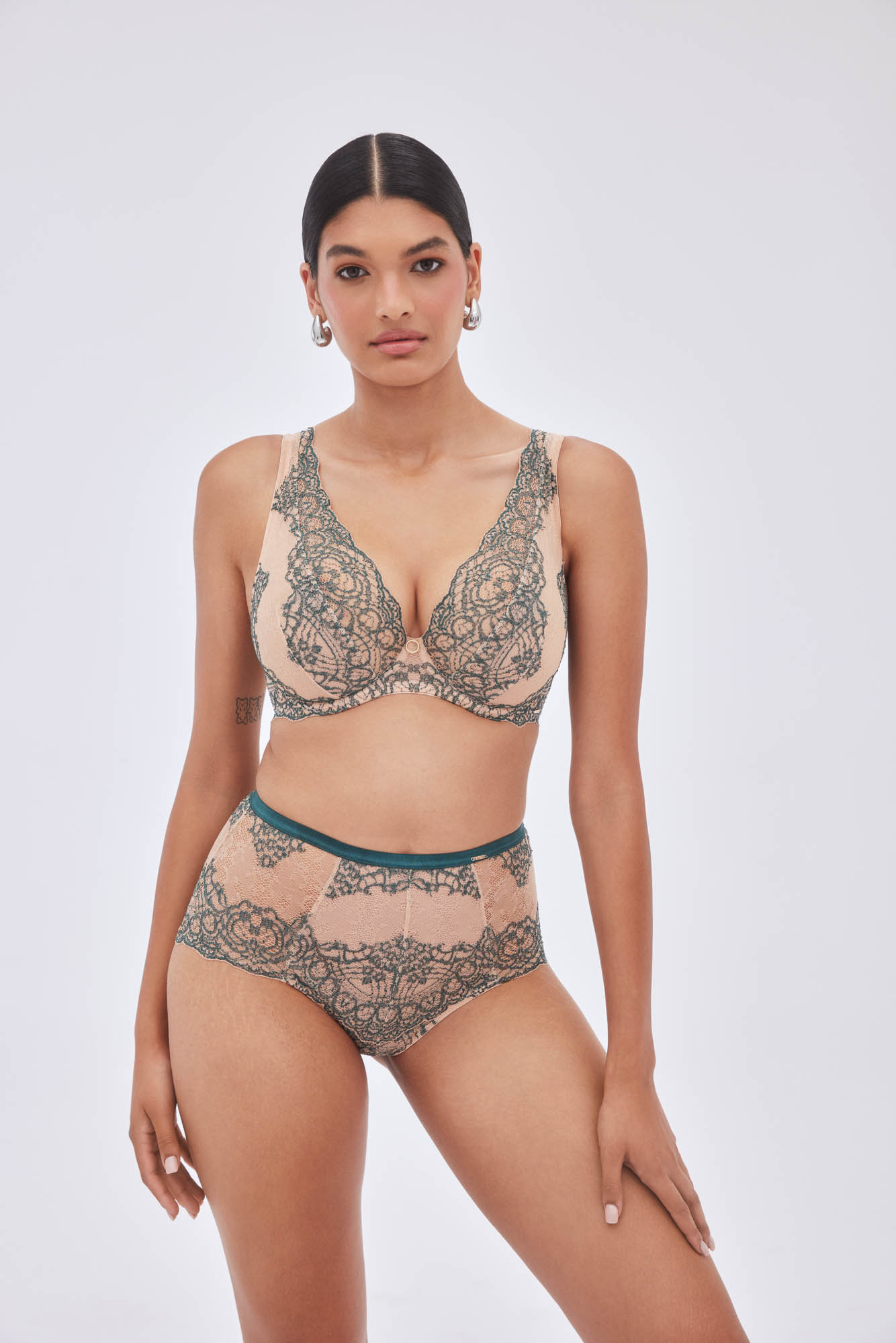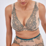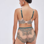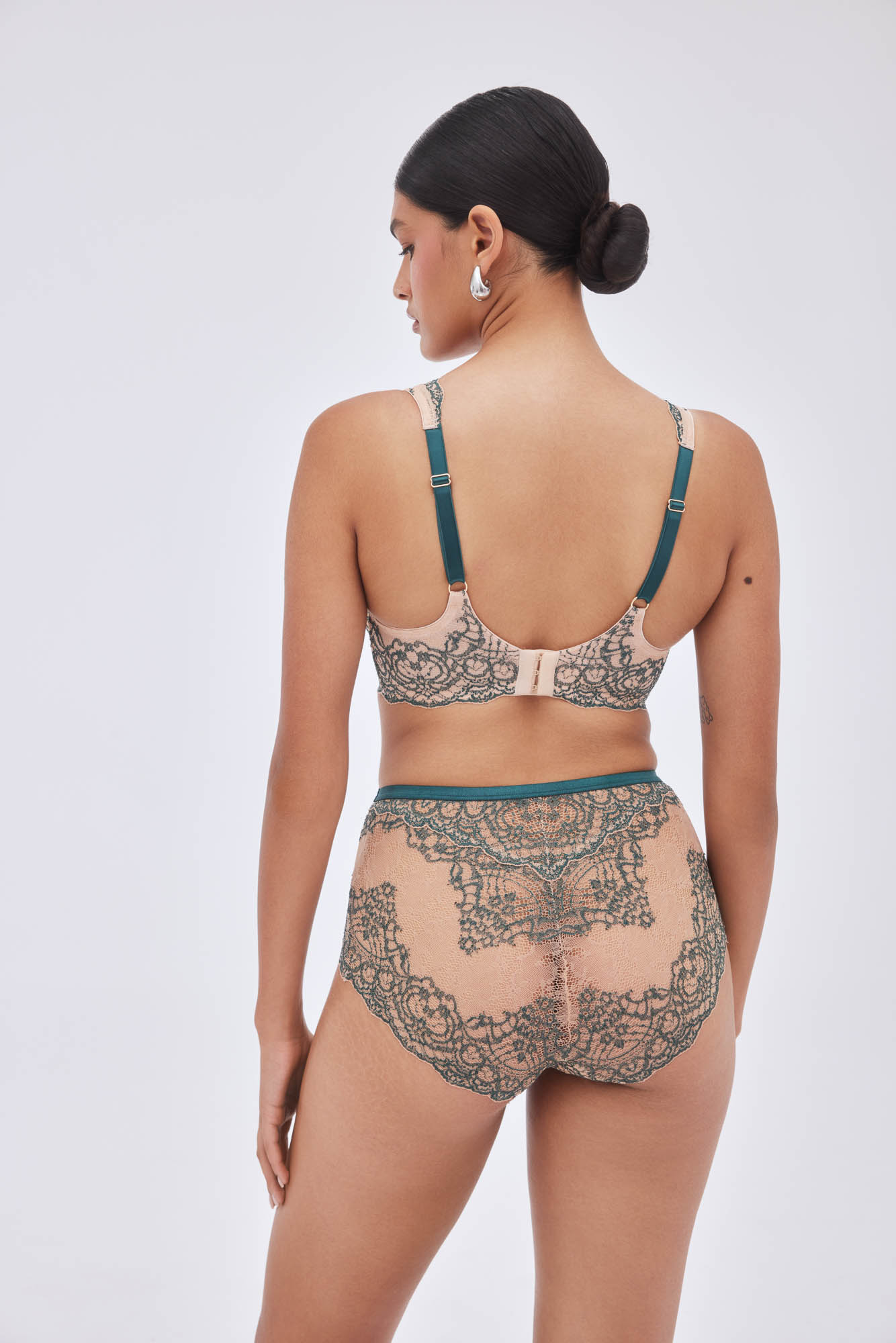 Бюстгальтер бралетт из коллекции выполнен на основе бюста с мягкими чашечками на косточках на каркасах, с дополнительными боковыми поддержками, чашки шитые из роскошного кружева телесного цвета с изумрудным орнаментом, продублированы телесной сеткой. Бретельки регулируются по длине, не отстгиваются. На спине застжка на удлинитель, количество крючков в ряду застжки увеличивается пропорционально размеру бюстгальтера, пояс из кружева продублирован телесной сеткой. Фурнитура металлическая цвета желтого золота. Бюстгальтер идеально сочетается с трусиками из коллекции .Splendore M бралетт бюст