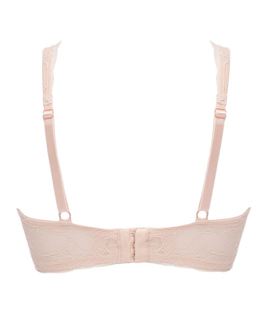 Бюстгальтер-бралетт из коллекции выполнен с мягкими, шитыми из гипюра, чашками на косточках, продублированными телесной сеткой, с дополнительными боковыми поддержками для предотвращения скручивания. Пояс из гипюра продублирован сеткой. Широкие бретели с подкладкой из мягкого пеноматериала регулируются по длине, отстгиваются на спинке. На спине застжка на удлинитель, количество крючков в ряду застжки увеличивается пропорционально размеру бюстгальтера, фурнитура металлическая матовая цвета меди. Между чашек украшение в виде подвески и атласной ленточки. Бюстгальтер идеально сочетается с трусиками из коллекции .