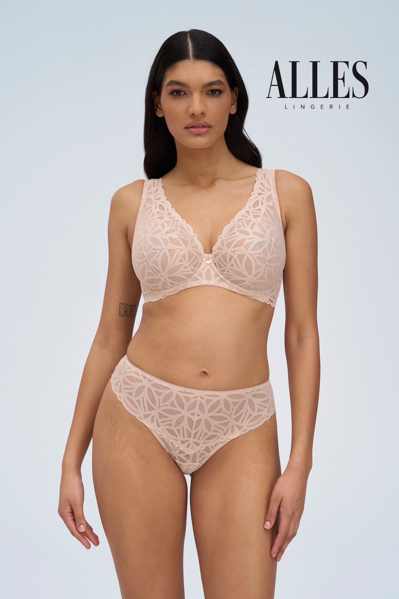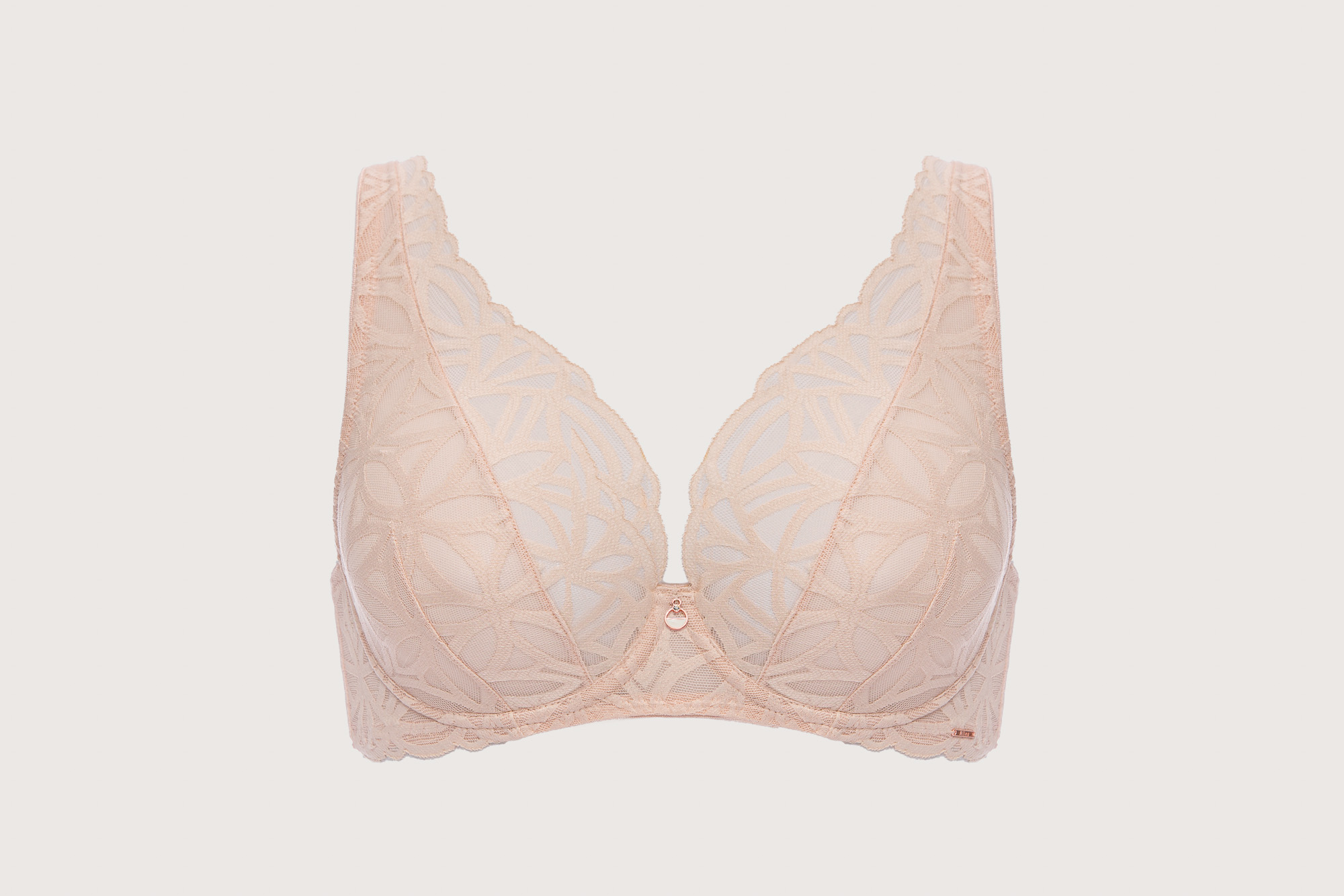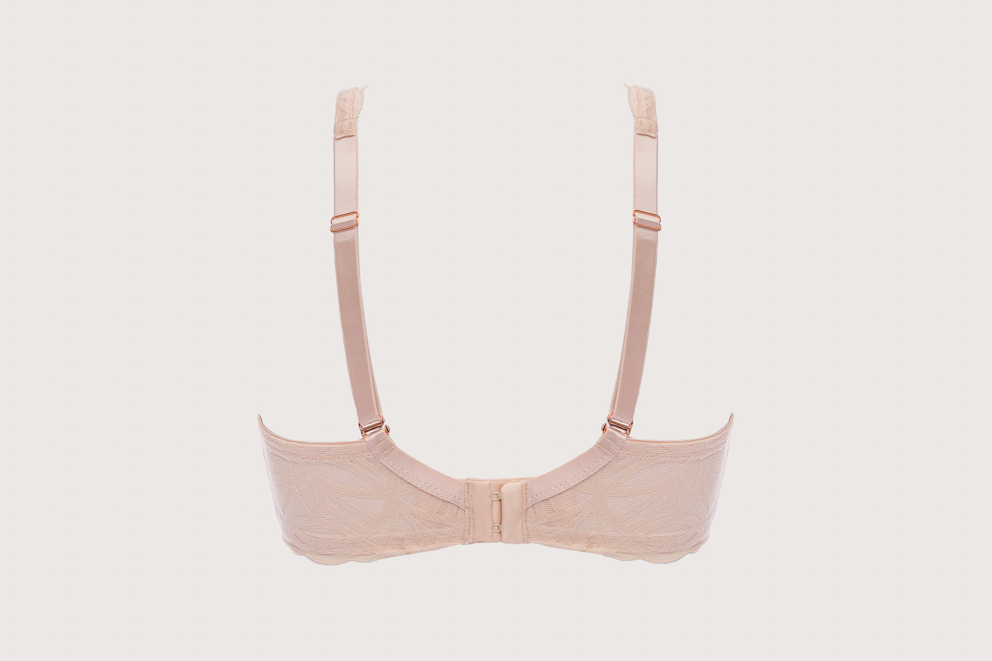 Бюстгальтер бралетт выполнен на основе бюста бралетт с мягкими чашечками на косточках, с дополнительными боковыми поддержками, чашки шитые, из кружева, продублированы телесной сеткой. Бретельки регулируются по длине, отстгиваются на спине, спинка кружевная продублирована сеткой. На спине застжка на удлинитель, количество крючков в ряду застжки увеличивается пропорционально размеру бюстгальтера, фурнитура металлическая цвета розового золота. Бюстгальтер идеально сочетается с трусиками из коллекции . Геометрический узор кружева выделяет коллекцию, напоминая мягкие линии дюн, созданных из карамельно-пудрового пескаSugarDune M бралетт бюст