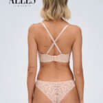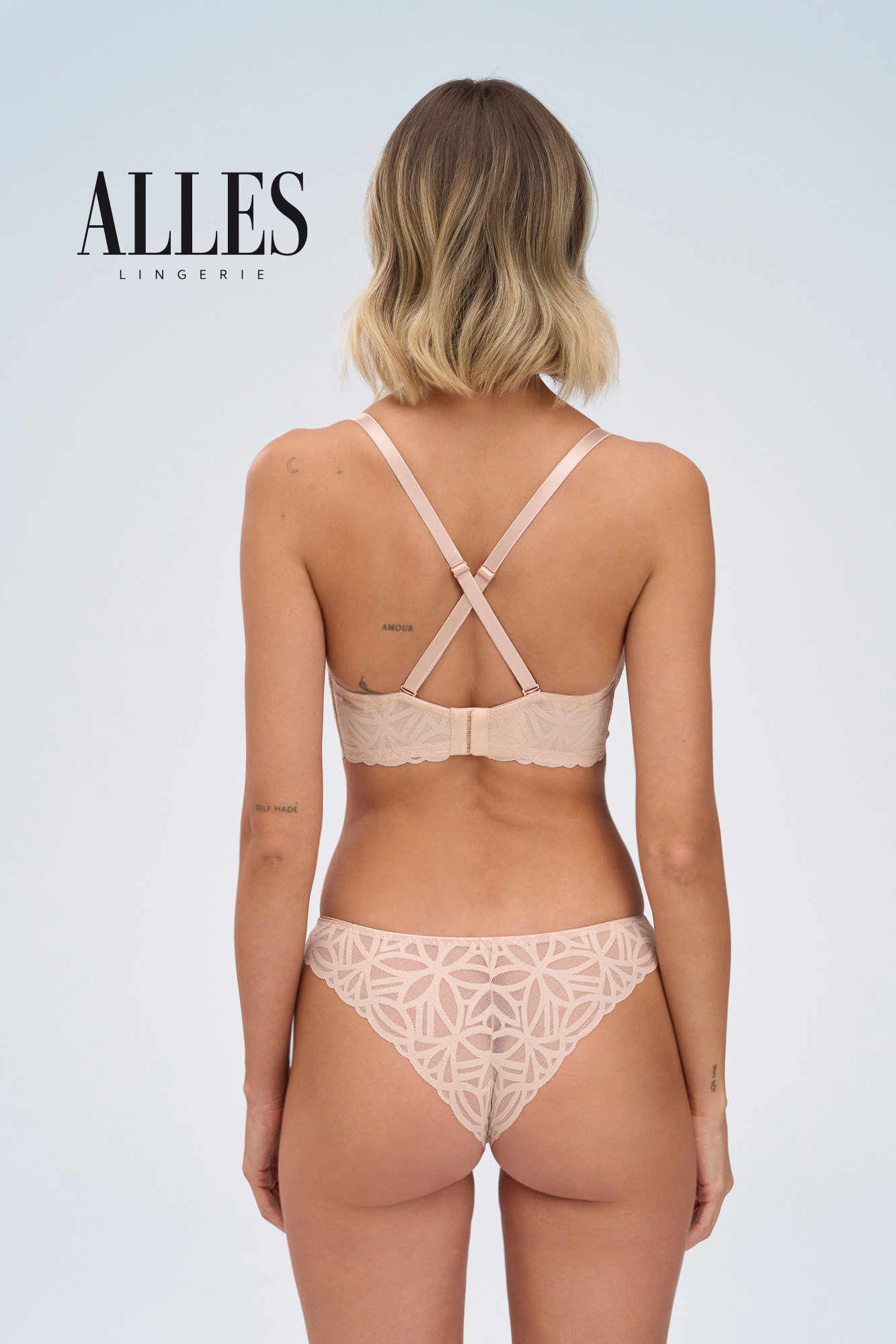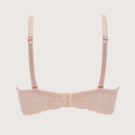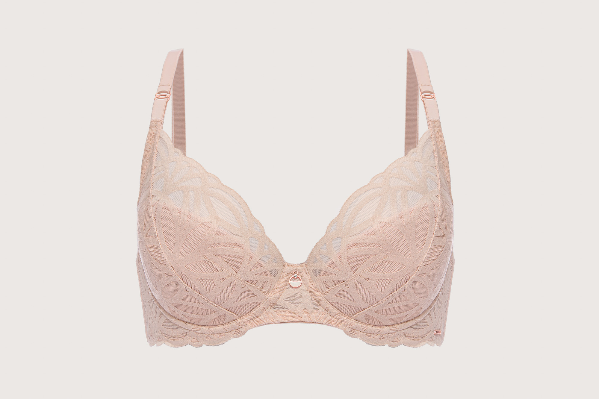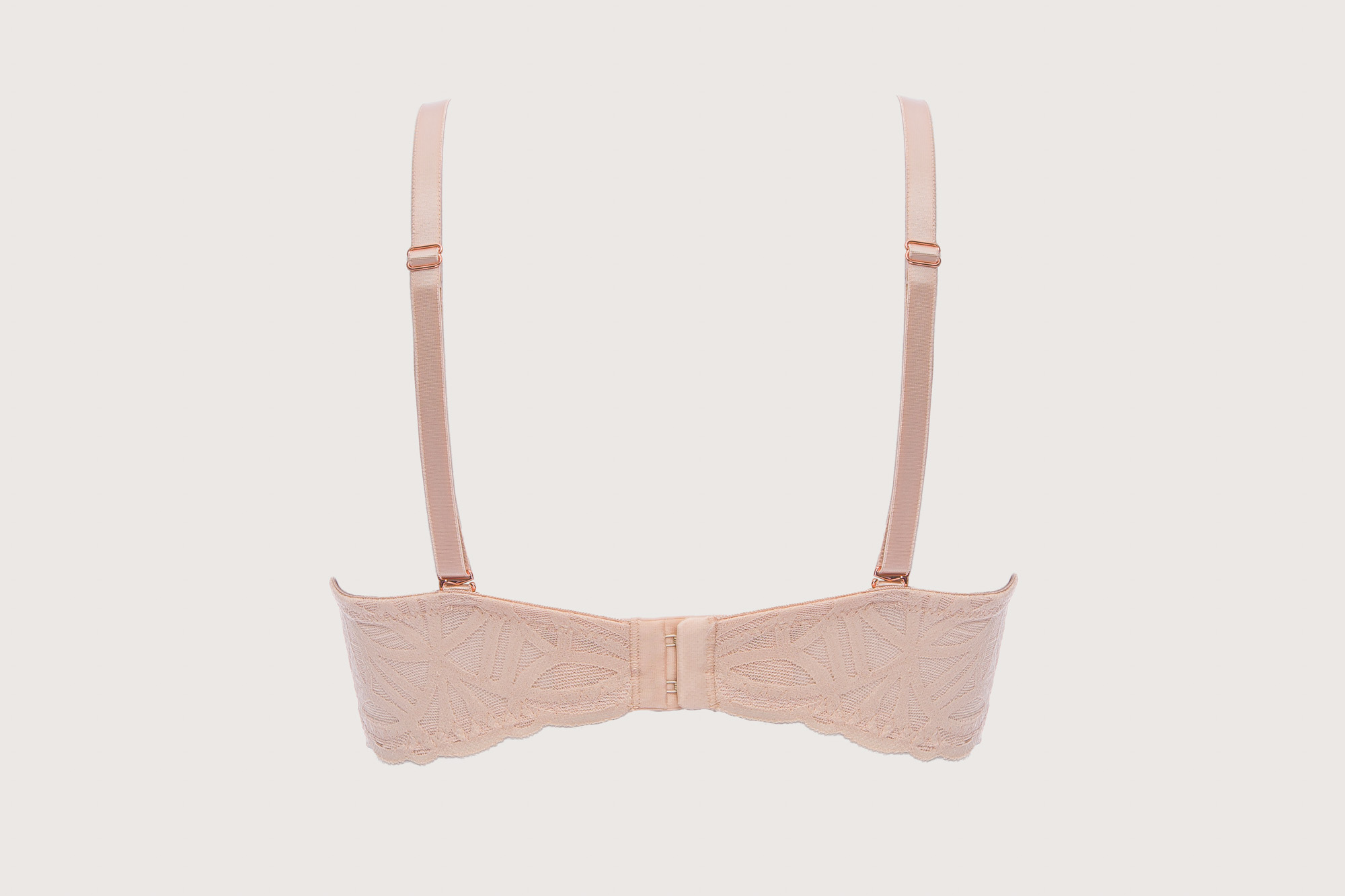 Бюстгальтер - выполнен на основе бюста - на косточках на каркасах, с дополнительными боковыми поддержками, чашки шитые на тонком поролоне телесного цвета, со съмными пуш-ап вкладышами, внешняя сторона чашки и спинка из кружева с геометрическим узором, пояс продублирован эластичной сеткой. Бретельки отстгиваются на спинке, регулируются по длине. На спине застжка на удлинитель, количество крючков в ряду застжки, увеличивается пропорционально размеру бюстгальтера, фурнитура металлическая цвета розового золота. Бюстгальтер идеально сочетается с трусиками . это уникальное сочетание повседневного комфорта и изысканной эстетикиSugarDune P-UP бюст