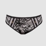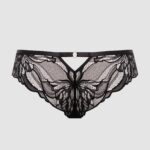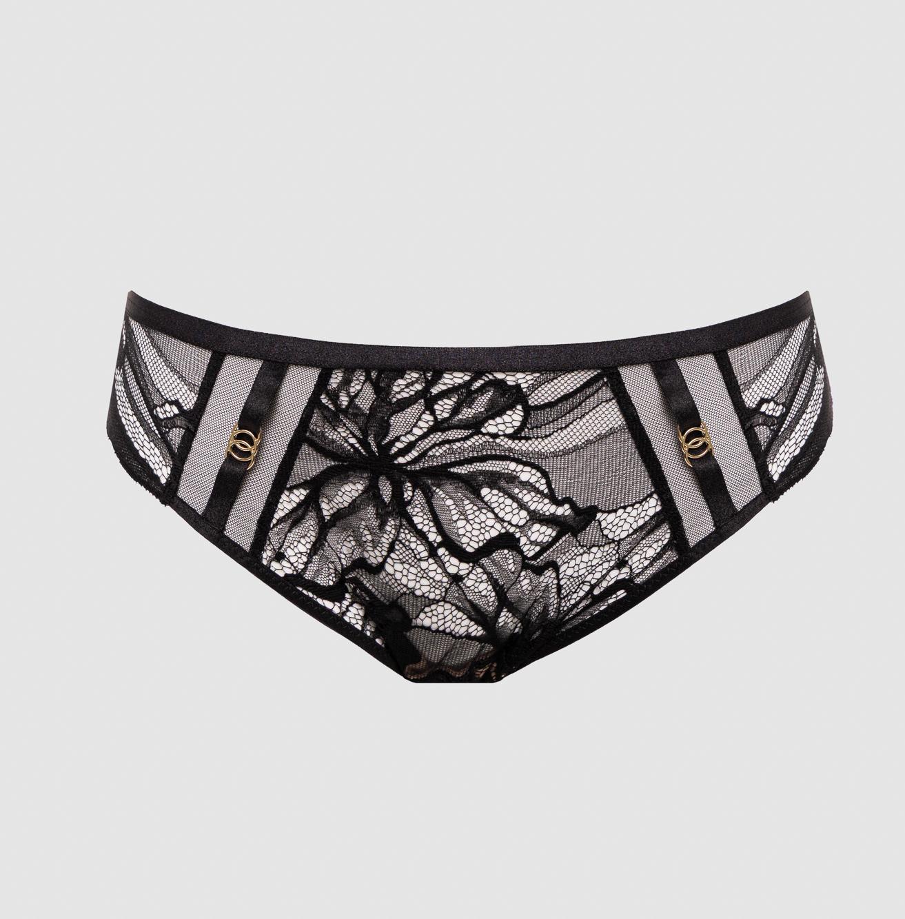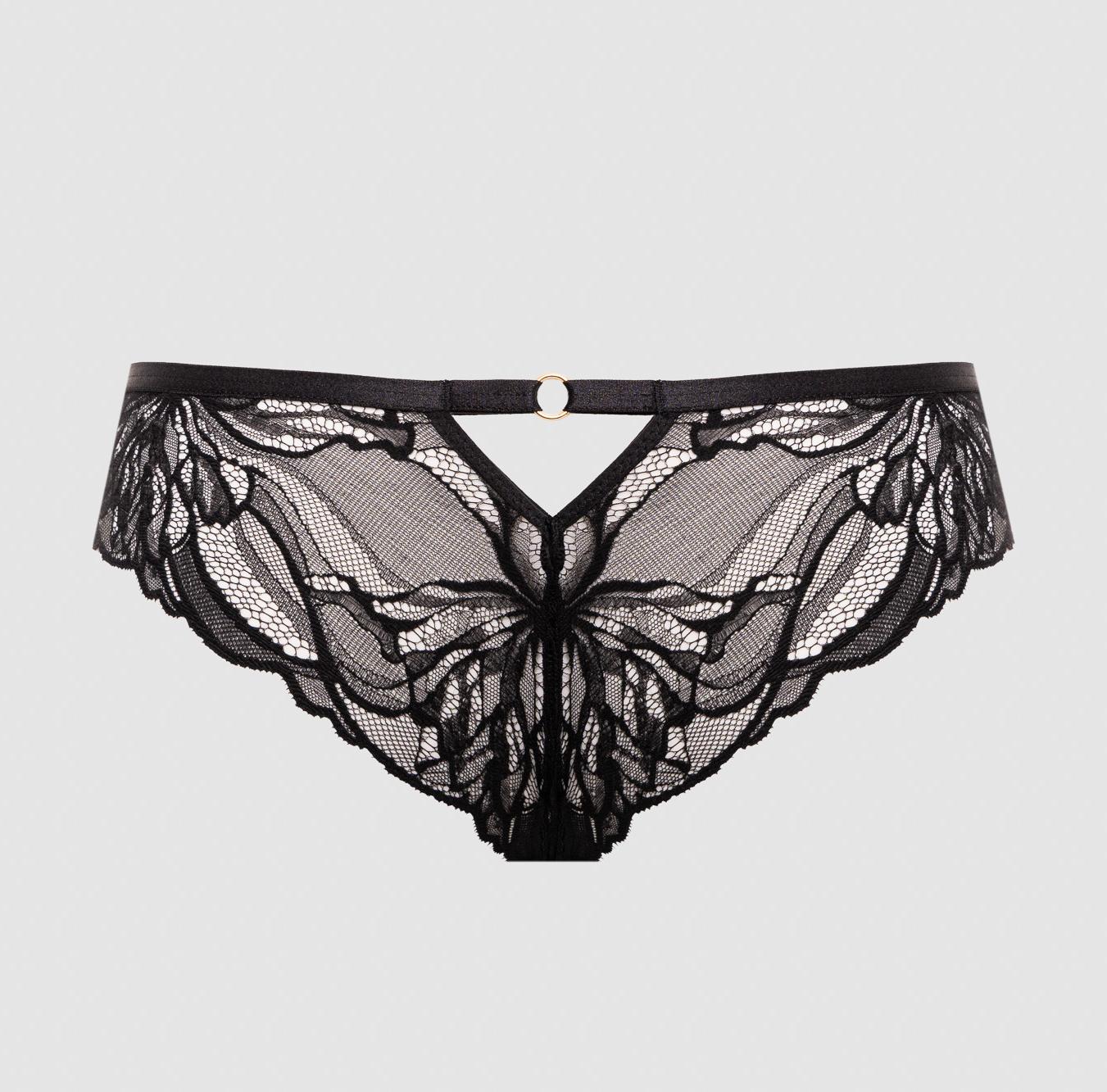 Трусики бразильяна из коллекции выполнены из кружева, на спинке -образный вырез, фурнитура металлическая цвета желтого золота. Ластовица проложена 100 хлопком телесного цвета.