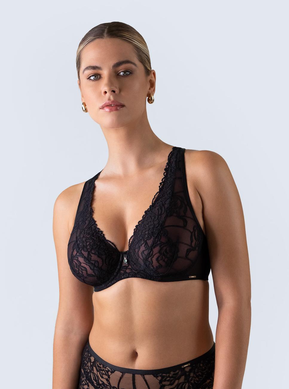 Бюстгальтер-бралетт из коллекции выполнен на основе бюста с мягкими, шитыми из роскошного черного кружева чашками, продублированными сеткой цвета трюфеля, на косточках, с дополнительными боковыми поддержками. Пояс из черной сетки продублирован сеткой цвета трюфеля. Широкие бретели с подкладкой из мягкого пеноматериала регулируются по длине, не отстгиваются. На спине застжка на удлинитель, количество крючков в ряду застжки увеличивается пропорционально размеру бюстгальтера, фурнитура металлическая цвета желтого золота. Бюстгальтер идеально сочетается с трусиками из коллекции .TruffleNoir M Plus бралетт бюст