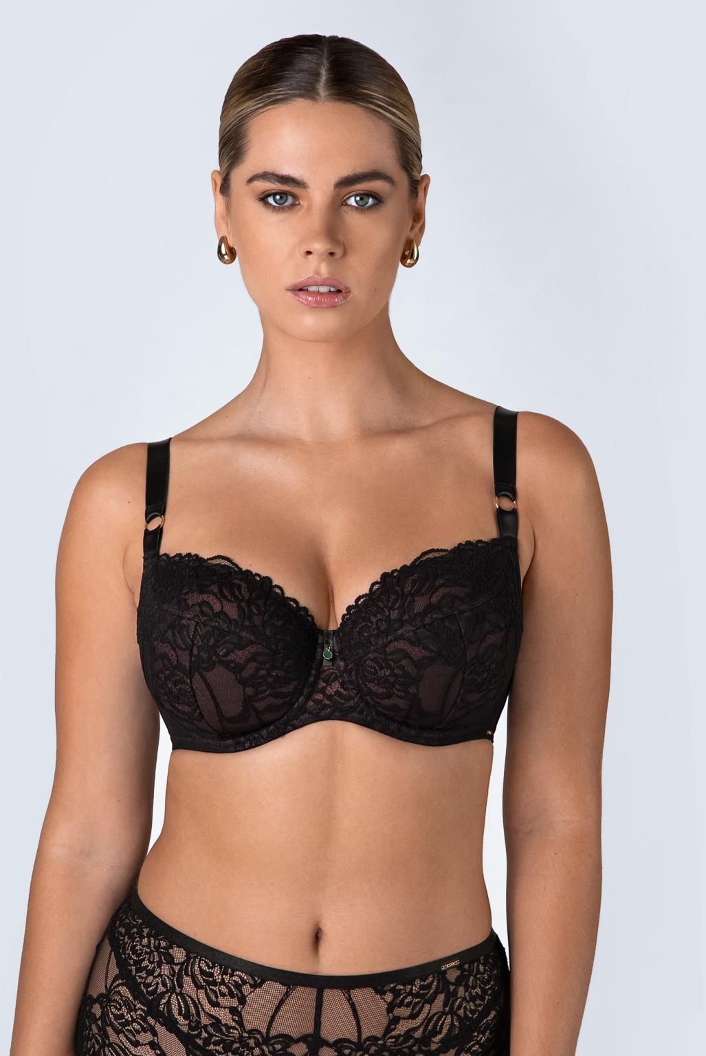 Бюстгальтер выполнен на основе бюста , на косточках на каркасах, с дополнительными боковыми поддержками, чашки шитые, нижняя часть на тонком поролоне цвета трюфеля, внутренняя сторона проложена хлопковым трикотажем, внешняя и верхняя часть чашки из кружевного полотна, спинка из черной продублирована сеткой цвета трюфеля. Бретельки не отстгиваются, регулируются по длине. На спине застжка на удлинитель, количество крючков в ряду застжки, увеличивается пропорционально размеру бюстгальтера, фурнитура металлическая цвета желтого золота. Бюстгальтер идеально сочетается с трусиками .TruffleNoir PU бюст
