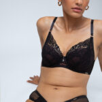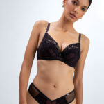 Трусики стринг из коллекции выполнены из кружева и черной сетки, спереди продублированы сеткой цвета трюфеля, на спинке -образный вырез, фурнитура металлическая цвета желтого золота. Ластовица проложена 100 хлопком цвета трюфеля.