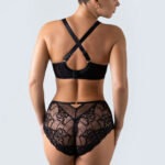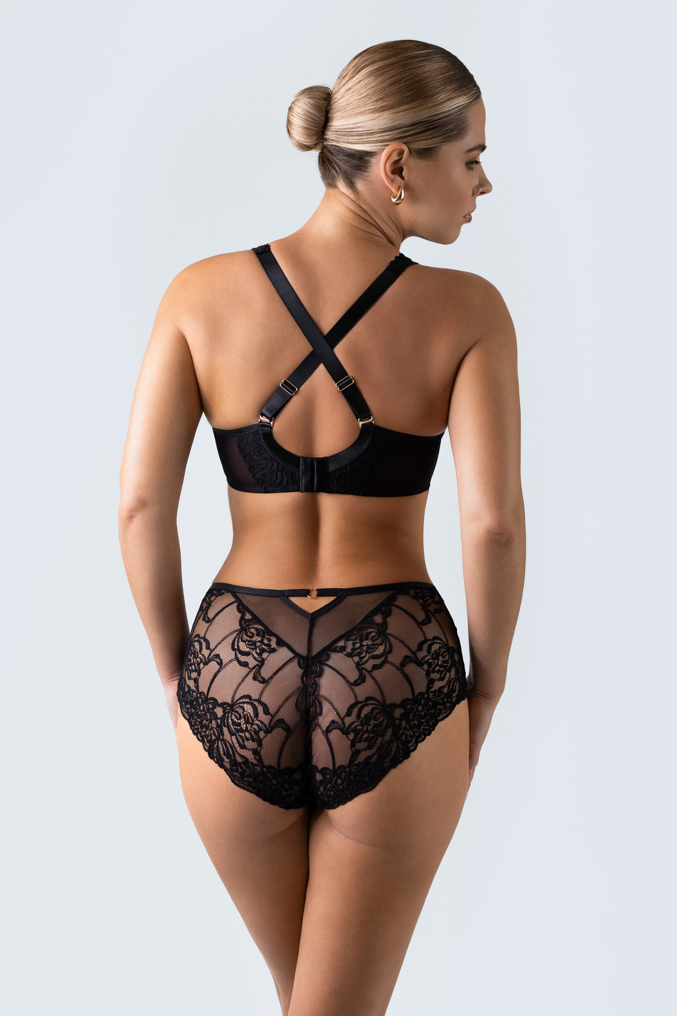 Трусики слип с завышенной талией из коллекции выполнены из кружева, спереди вставка из черной сетки продублирована сеткой цвета трюфеля, на спинке -образный вырез, фурнитура металлическая цвета желтого золота. Ластовица проложена 100 хлопком цвета трюфеля.TruffleNoir трусы с завышенной талией