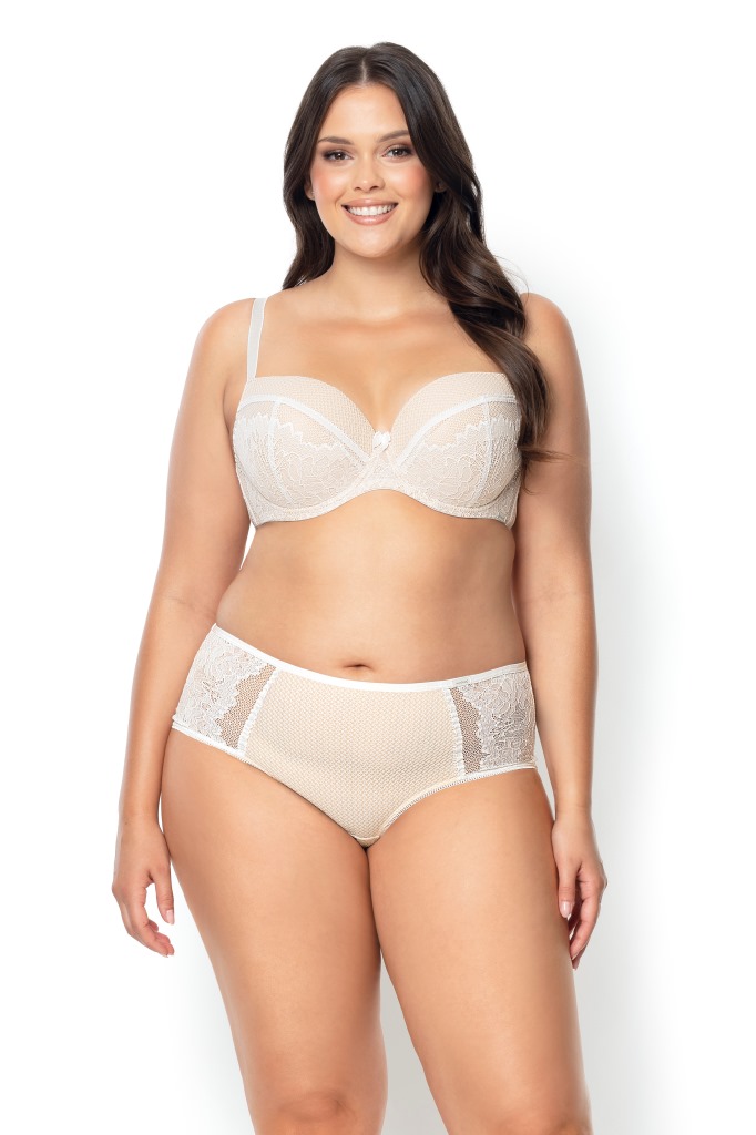 Бюстгальтер выполнен на косточках, с дополнительными боковыми поддержками, чашки шитые, на тонком поролоне телесного цвета, со съмными пуш-ап вкладышами, внутренняя сторона проложена хлопковым трикотажем, внешняя сторона чашек из кружева и сетки, спинка из сетки. Бретельки не отстгиваются, регулируются по длине, фурнитура металлическая крашеная. На спине застжка на удлинитель, количество крючков в ряду застжки, увеличивается пропорционально размеру бюстгальтера. Бюстгальтер идеально сочетается с трусиками .Zara U бюст экрю BF25
