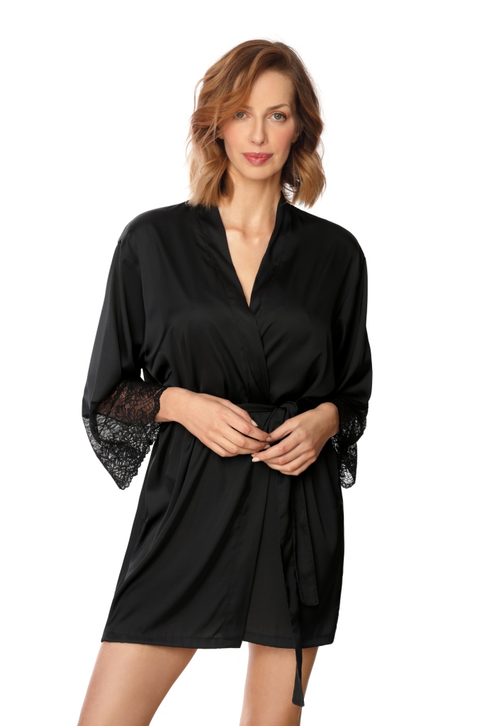 Халат короткий с рукавом 3/4, по низу рукавов широкое кружево, пояс в комплекте.