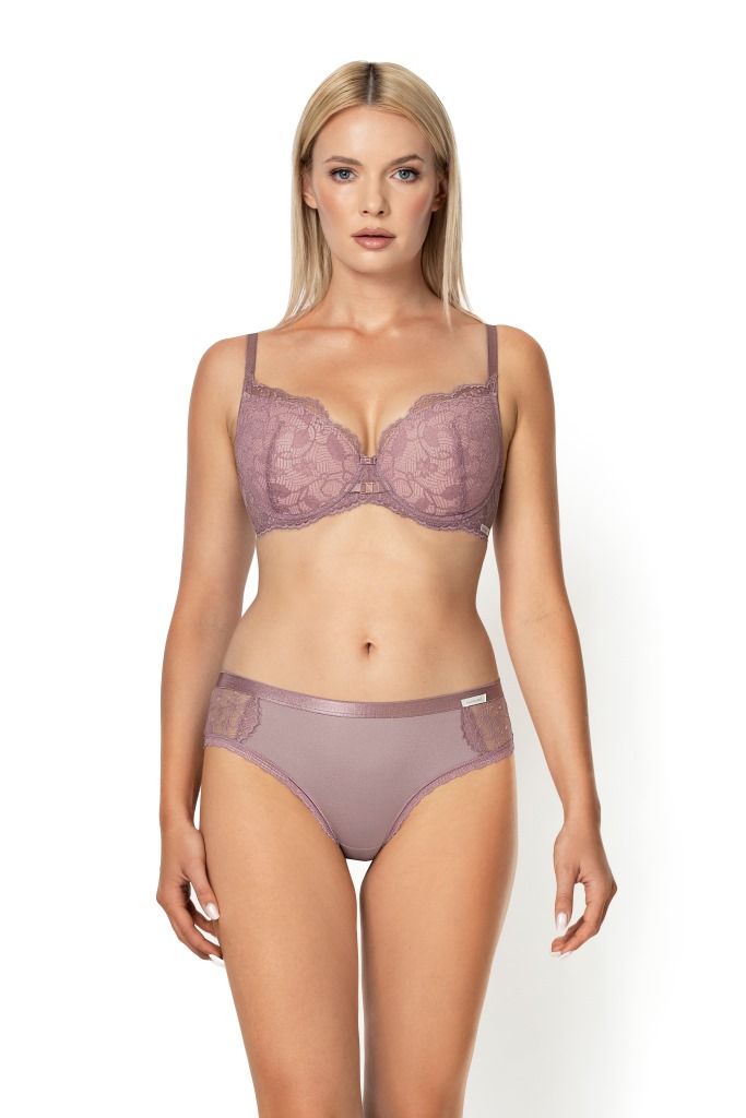 Бюстгальтер на косточках, с дополнительными боковыми поддержками, чашки формованные, на тонком поролоне, со съмными пуш-ап вкладышами, внутренняя сторона проложена хлопковым трикотажем, внешняя сторона кружевная. Бретельки не отстгиваются, регулируются по длине, фурнитура металлическая цвета меди. На спине застжка на удлинитель, количество крючков в ряду застжки, увеличивается пропорционально размеру бюстгальтера. Бюстгальтер идеально сочетается с трусиками .
